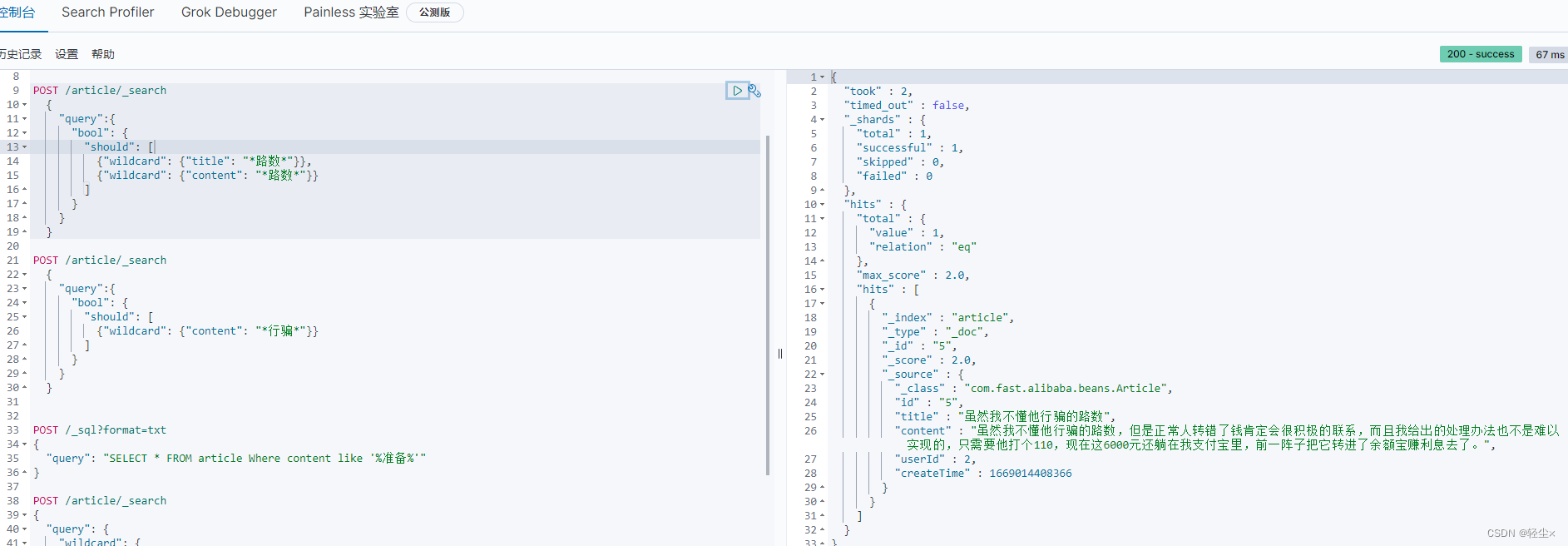 使用dsl查询语句如下,构建一个query ,should只要一个匹配即可