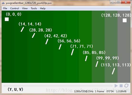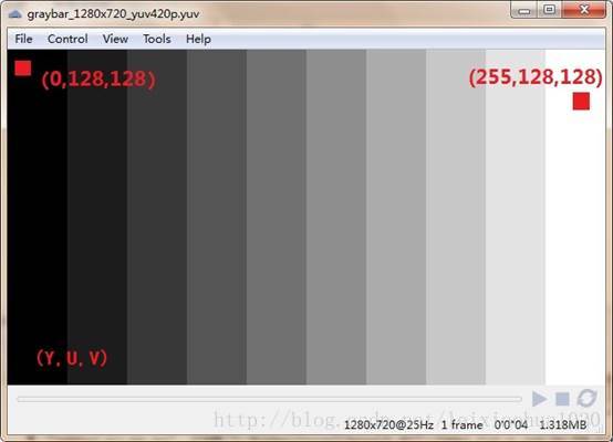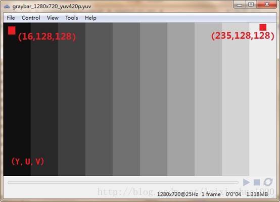 下面这张图的分辨率是1280x720,像素格式是YUV420P,亮度的取值范围是0-255,一共包含了10级的灰度。最左边的灰度竖条的YUV取值为(0,128,128),最右边的灰度竖条的YUV取值为(255,128,128)。