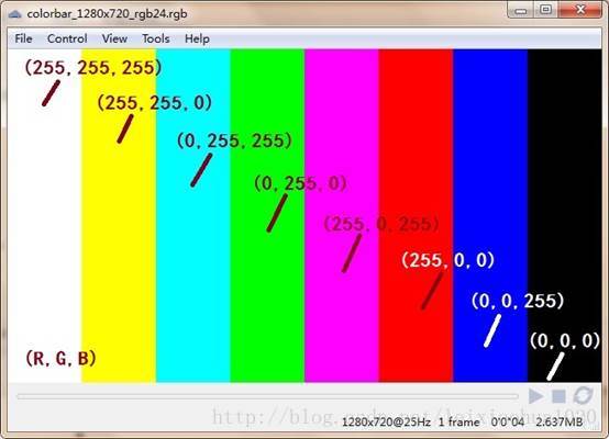 在电视节目的制作播出及设备维护中,最常用的莫过于彩条信号了。这是由于彩条信号能正确反映出各种彩色的亮度、色调和饱和度,是检验视频通道传输质量最方便的手段。下面这张图是一张彩条测试图的示例。这张图的分辨率是1280x720,像素格式是RGB24,包含了电视系统中常见的“白黄青绿品红蓝黑”彩条。“白黄青绿品红蓝黑”彩条中每种颜色的RGB取值如下所示: