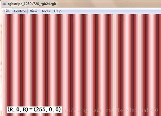 条纹图也是常见的一种测试图。下面这张图是一张彩色条纹图的示例。这张图的分辨率是1280x720,像素格式是RGB24,条纹的颜色为红色。其中竖直条纹的宽度为1像素,条纹之间的间隔也是1像素。函数原型