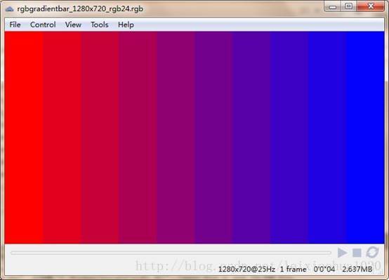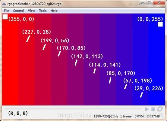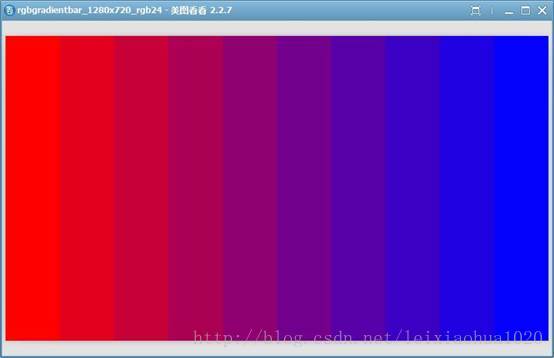 下面这张图是一张RGB渐变彩条图的示例。这张图的分辨率是1280x720,一共包含了10个彩条,像素格式是RGB24,RGB颜色从红色(RGB分别取值为255,0,0)逐渐变换为蓝色(RGB分别取值为0,0,255)。每个彩条的RGB取值如下所列: