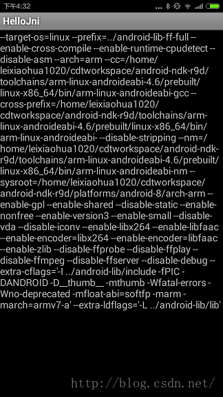 JNIEXPORT jstring Java_com_leixiaohua1020_sffmpegandroidhelloworld_MainActivity_configurationinfo(JNIEnv *env, jobject obj)