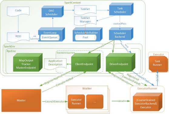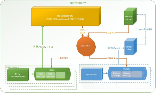 - RpcEnv:RPC 上下文环境,每个 RPC 终端运行时依赖的上下文环境称为 RpcEnv;在把当前 Spark 版本中使用的 NettyRpcEnv