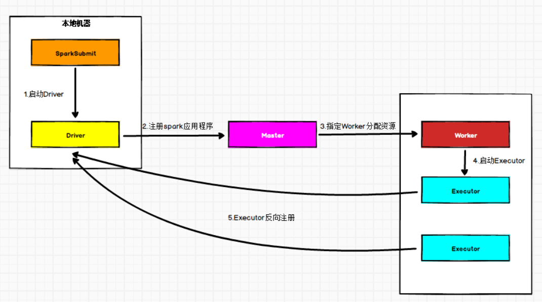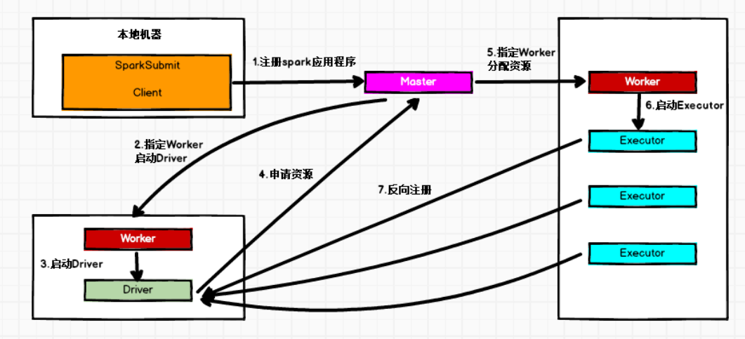 在 Standalone Cluster 模式下,任务提交后,Master 会找到一个 Worker 启动 Driver。Driver 启动后向 Master 注册应用程序,Master 根据 submit 脚本的资源需求找到内部资源至少可以启动一个Executor 的所有 Worker,然后在这些 Worker 之间分配 Executor,Worker 上的 Executor 启动后会向Driver 反向注册,所有的 Executor 注册完成后,Driver 开始执行 main函数,之后执行到Action 算子时,开始划分Stage,每个 Stage 生成对应的 taskSet,之后将Task 分发到各个 Executor 上执行