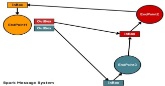 Endpoint(Client/Master/Worker)有 1 个 InBox 和N 个OutBox(N>=1,N 取决于当前 Endpoint与多少其他的Endpoint 进行通信,一个与其通讯的其他Endpoint 对应一个OutBox),Endpoint接收到的消息被写入InBox,发送出去的消息写入 OutBox 并被发送到其他Endpoint 的InBox中