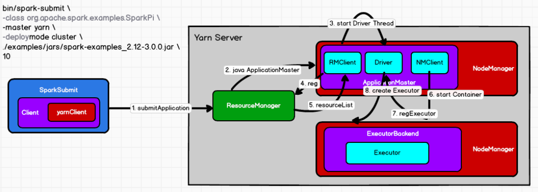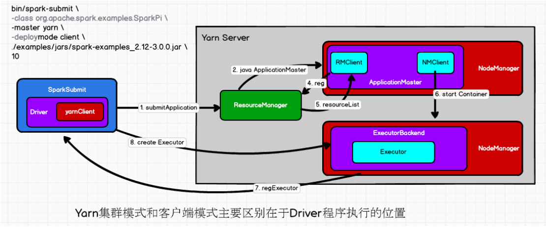注意:SparkSubmit、ApplicationMaster 和 YarnCoarseGrainedExecutorBackend 是独立的进程;Executor 和Driver 是对象