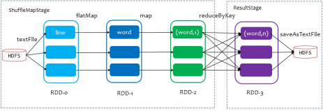 Job 由 saveAsTextFile 触发,该 Job 由 RDD-3 和 saveAsTextFile 方法组成,根据 RDD 之间的依赖关系从RDD-3 开始回溯搜索,直到没有依赖的 RDD-0,在回溯搜索过程中,RDD-3 依赖 RDD-2,并且是宽依赖,所以在RDD-2 和 RDD-3 之间划分 Stage,RDD-3 被划到最后一个 Stage,即 ResultStage 中,RDD-2 依赖RDD-1,RDD-1 依赖RDD-0,这些依赖都是窄依赖,所以将 RDD-0、RDD-1 和 RDD-2 划分到同一个 Stage,形成 pipeline 操作,即ShuffleMapStage 中,实际执行的时候,数据记录会一气呵成地执行 RDD-0 到 RDD-2 的转化。不难看出,其本质上是一个深度优先搜索(Depth First Search)算法