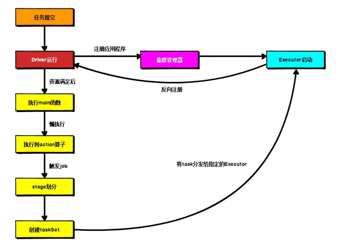 - Driver 开始执行 main 函数,Spark 查询为懒执行,当执行到 Action 算子时开始反向推算,根据宽依赖进行 Stage 的划分,随后每一个 Stage 对应一个Taskset,Taskset 中有多个 Task,查找可用资源Executor 进行调度;