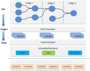 - TaskScheduler 负责Task 级的调度,将 DAGScheduler 给过来的TaskSet 按照指定的调度策略分发到 Executor 上执行,调度过程中 SchedulerBackend 负责提供可用资源,其中SchedulerBackend 有多种实现,分别对接不同的资源管理系统