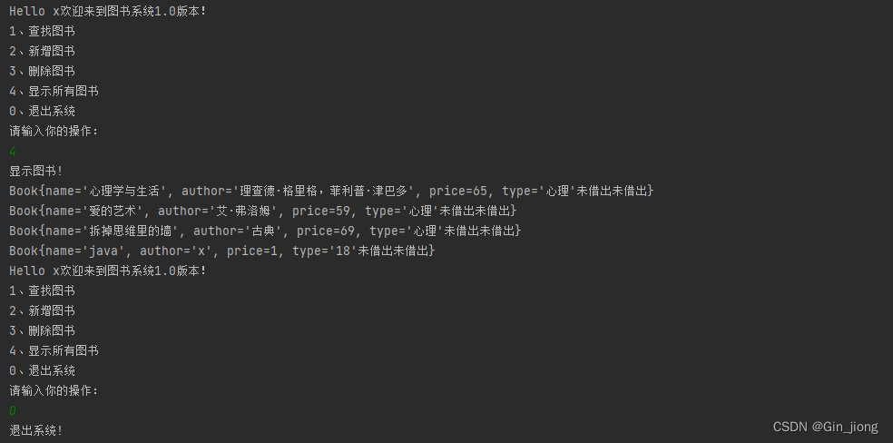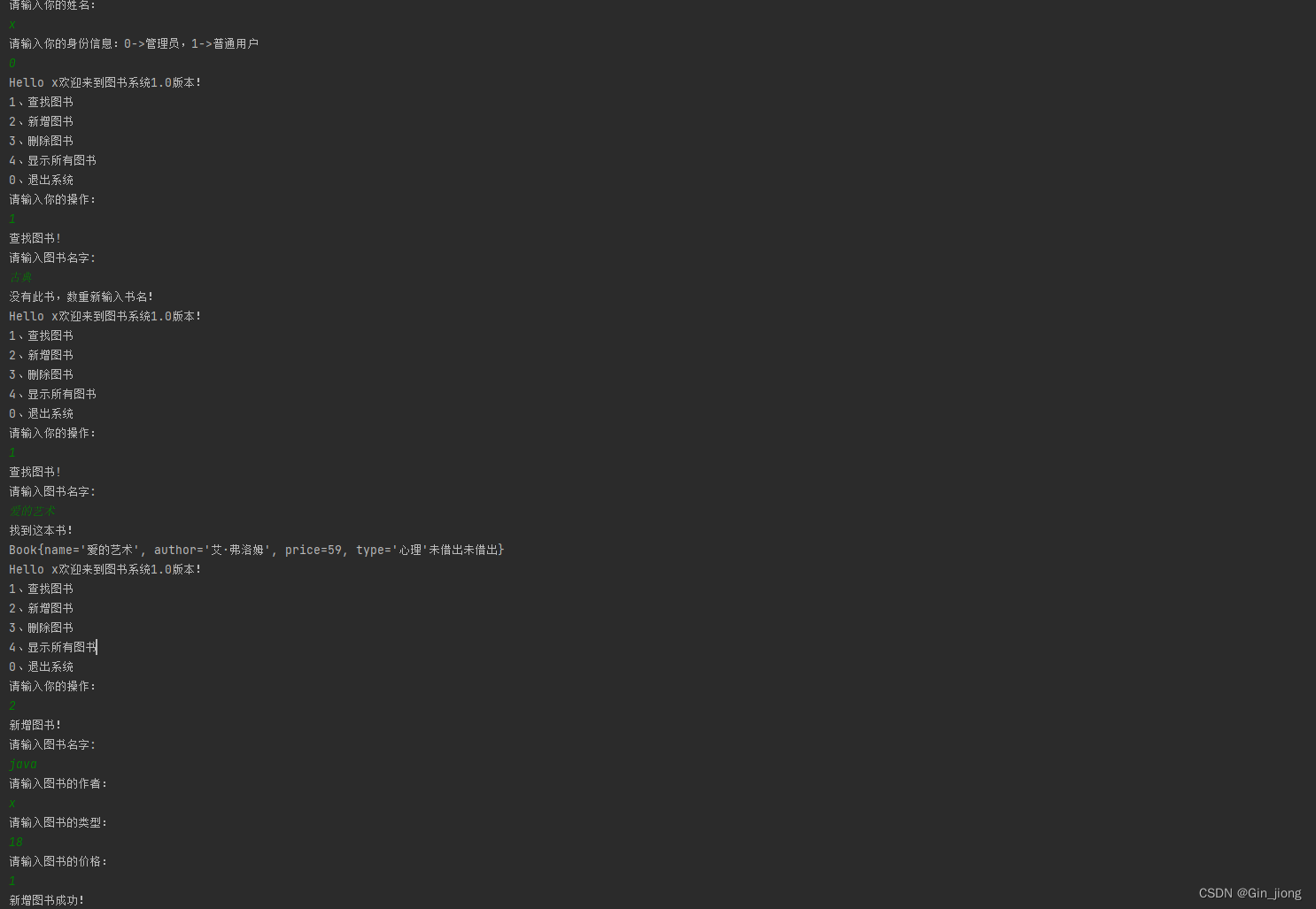 package operation; import book.Book; import book.BookList; import java.util.Scanner; public class AddOperation implements IOperation{ @Override public void work(BookList bookList) { System.out.println("新增图书!"); Scanner scanner = new Scanner(System.in); System.out.println("请输入图书名字:"); String name = scanner.nextLine(); System.out.println("请输入图书的作者:"); String author = scanner.nextLine(); System.out.println("请输入图书的类型:"); String type = scanner.nextLine(); System.out.println("请输入图书的价格:"); int price = scanner.nextInt(); Book book = new Book(name,author,price,type); int currentSize = bookList.getUsedSize(); bookList.setBooks(currentSize,book); bookList.setUsedSize(currentSize+1); System.out.println("新增图书成功!"); } }
