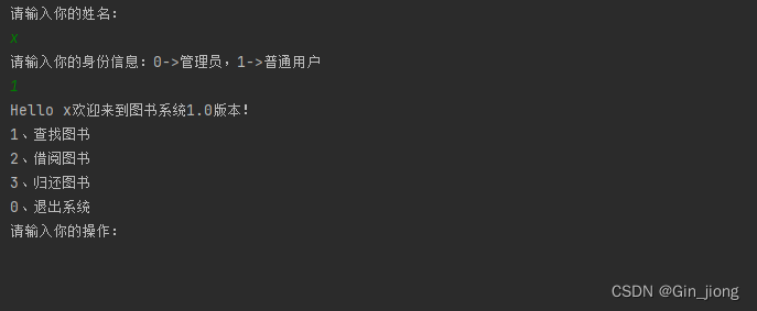 import book.BookList; import user.AdminUser; import user.NormalUser; import user.User; import java.util.Scanner; public class Main { public static User login(){ System.out.println("请输入你的姓名:"); Scanner scanner = new Scanner(System.in); String name = scanner.nextLine(); System.out.println("请输入你的身份信息:0->管理员,1->普通用户"); int choice = scanner.nextInt(); if (choice == 0){ return new AdminUser(name); }else { return new NormalUser(name); } } public static void main(String[] args) { BookList bookList = new BookList();//准备图书 //登录 User user = login(); while (true){ int choice = user.menu(); user.doDperation(choice,bookList); } } }