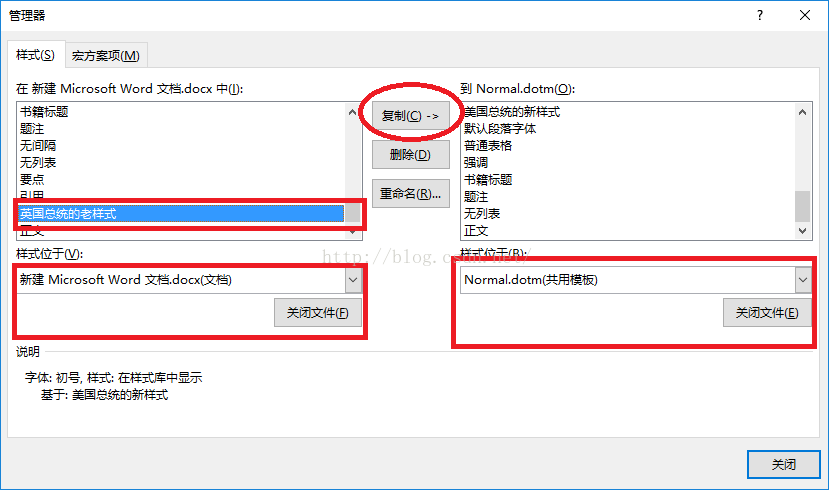 - 弹出“管理器”对话框,左边的样式使当前文件里的,右边的样式位于模板Normal.dotm中,