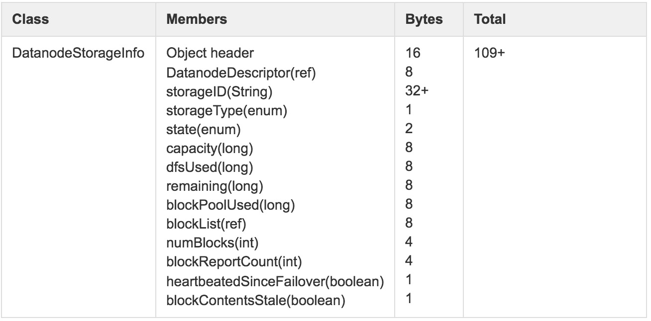 除此之外,DatanodeDescriptor还包括一部分动态内存对象,如replicateBlocks、recoverBlocks和invalidateBlocks等与数据块动态调整相关的数据结构,pendingCached、cached和pendingUncached等与集中式缓存相关的数据结构。由于这些数据均属动态的形式临时存在,随时会发生变化,所以这里没有做进一步详细统计(结果存在少许误差)。