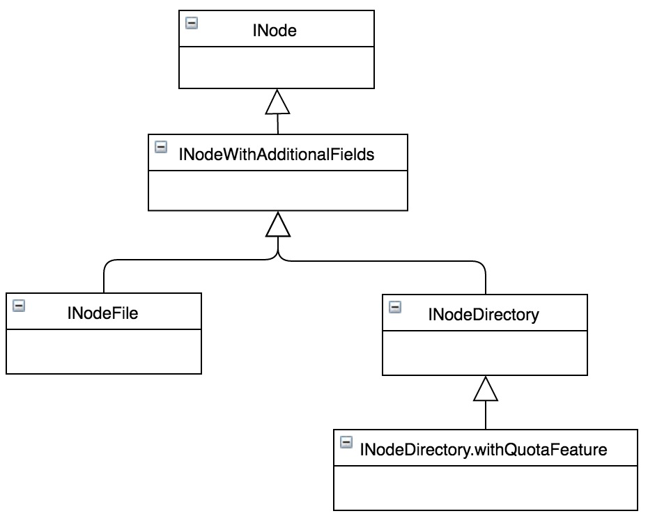 除图中提到的属性信息外,一些附加如ACL等非通用属性,没有在统计范围内。在默认场景下,INodeFile和INodeDirectory.withQuotaFeature是相对通用和广泛使用到的两个结构。