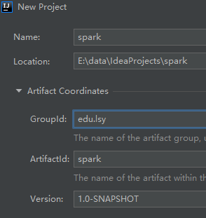 - 打开IDEA,新建Maven Project【spark】,填写Maven的GAV