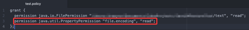 这里发现os.name也读取出来了,这是因为Java的安全策略默认包含了一些基础权限,如果换成file.encoding,则需要添加额外的读取授权