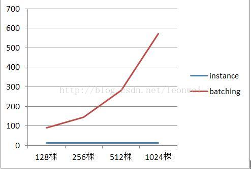 3) 渲染时间上看,instance即使在1024棵树的时候,也几乎和128棵树相差不多,因为cpu需要做的事情,绘制100棵和1棵差别不大,但是batching会大幅上升