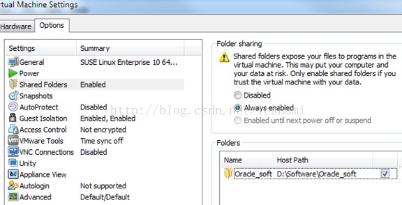 右单击你需要设置该功能的虚拟机,单击options,可以看到Shared Folders功能