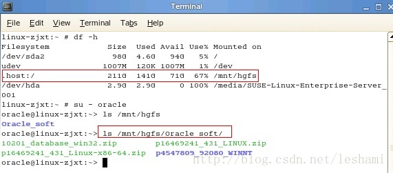 最下面的是共享后的结果图,非root用户也可以访问,如下oracle用户可以查看到设置的共享文件夹