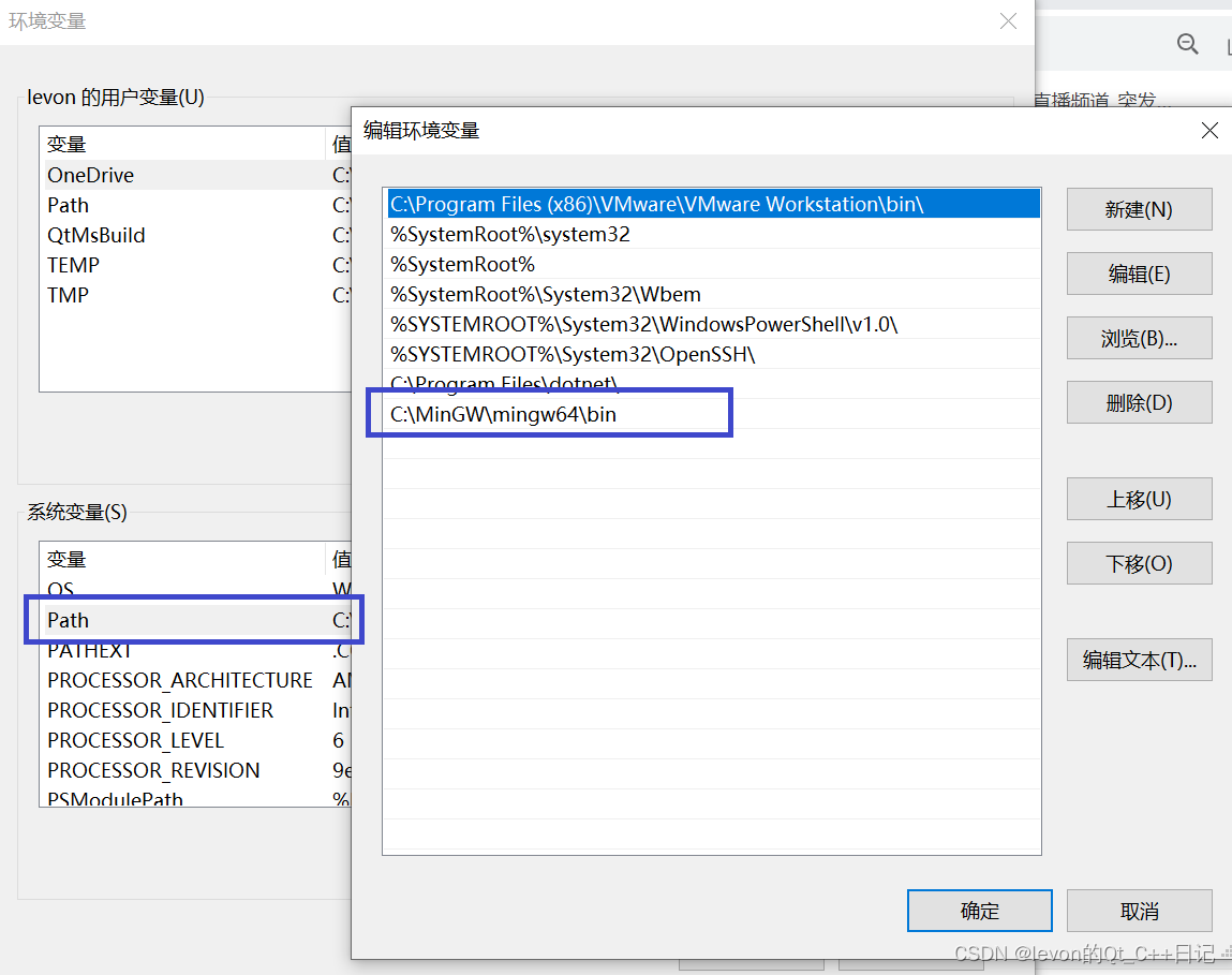 4)双击系统变量中的“path”,将mingw64安装路径下的bin路径添加到新的一行,点击确定