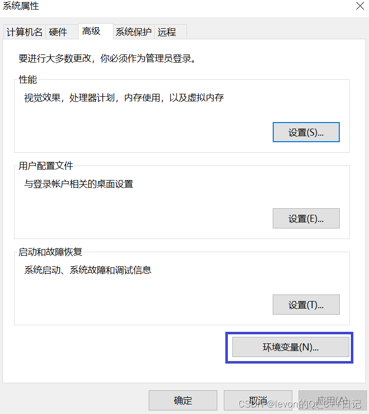 3)进入高级系统,选择“高级"一栏,点击“环境变量”