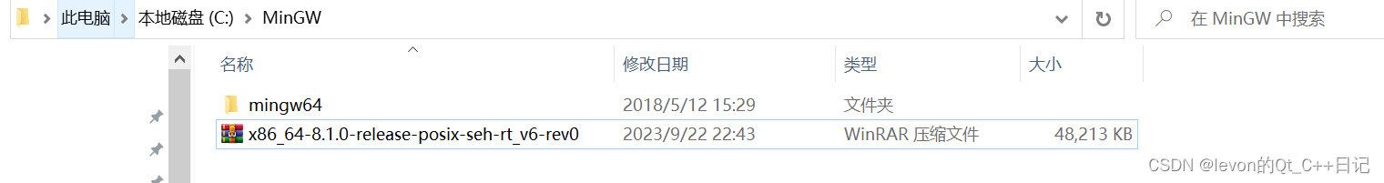 4、将下载的压缩包放到任意位置上进行解压,这里我在C盘上创建一个新路径MinGW,然后放在这个下面,解压后如下图所示
