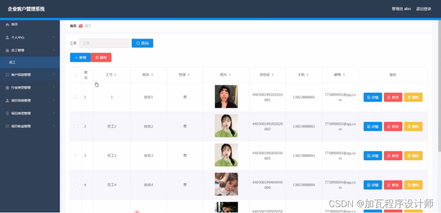 客户信息管理,在客户信息管理页面中通过填写客户名称、行业类型、性别、年龄、照片、手机、身份证、备注、工号、姓名等信息内容,并且根据需要对已有客户信息管理进行详情、修改、删除等其他详细操作,如图所示。