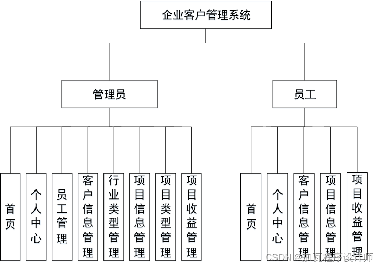 管理员登录进入企业客户管理系统可以查看首页、个人中心、员工管理、客户信息管理、行业类型管理、项目信息管理、项目类型管理、项目收益管理等信息。