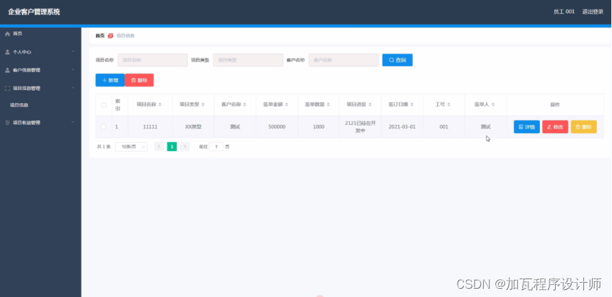 项目信息管理,在项目信息管理页面中可以填写项目名称、项目类型、客户名称、签单金额、签单数量、项目进度、签订日期、工号、签单人等信息内容,并且根据需要对已有项目信息管理进行详情、修改、删除等详细操作,如图所示。