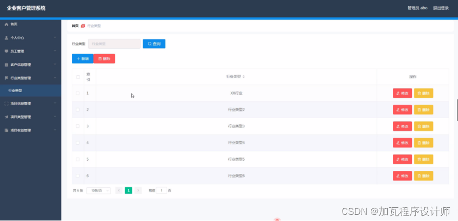 行业类型管理,在行业类型管理页面中可以填写行业类型等内容,并可根据需要对已有行业类型管理进行修改或删除等操作,如图所示。
