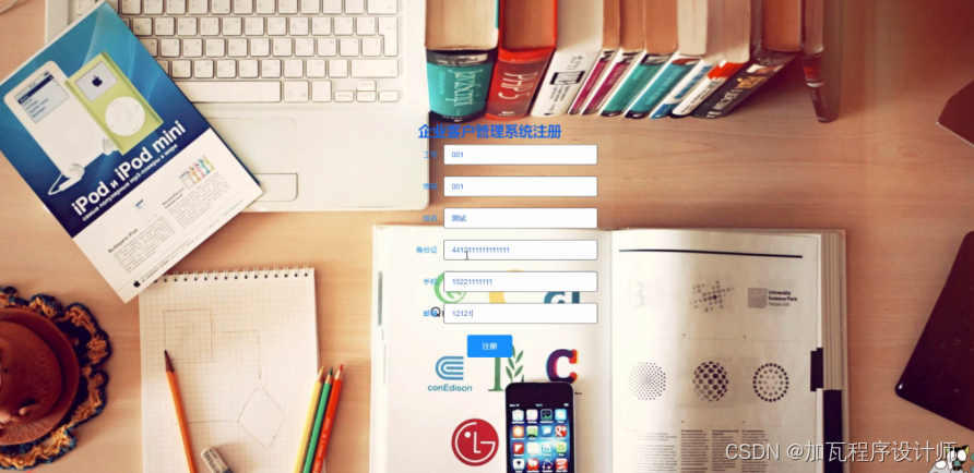 员工登录进入企业客户管理系统可以查看首页、个人中心、客户信息管理、项目信息管理、项目收益管理等内容。 员工注册,员工注册通过填写输入工号、姓名、性别、照片、身份证、手机、邮箱等信息即可进行员工注册,如图所示。