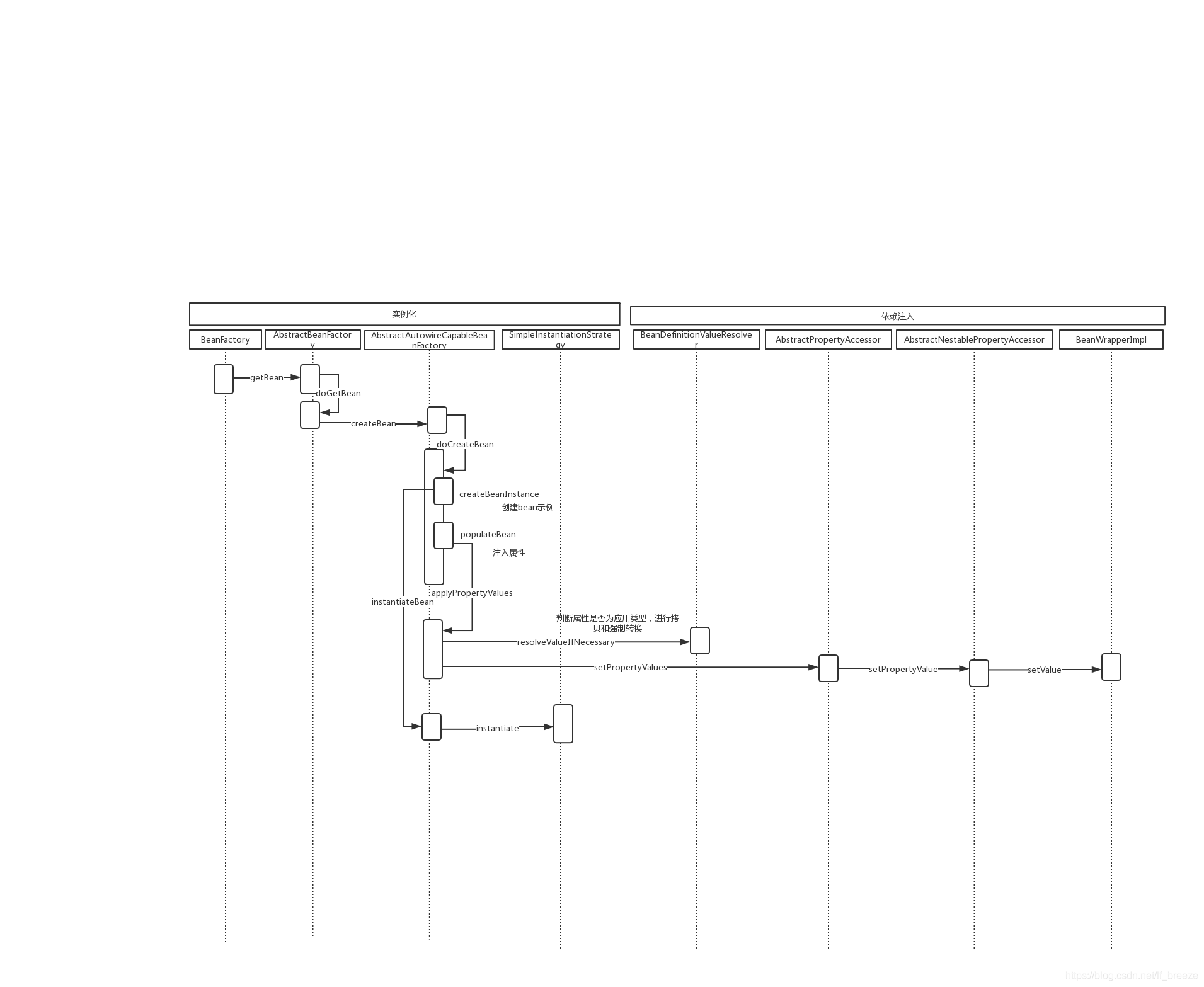 调用BeanFatory的getBean方法->AbstractBeanFactory的getBean方法的具体实现->调用AbstractAutowireCapableBeanFactory的createBean方法->AbstractAutowireCapableBeanFactory的doCreateBean方法->先执行createBeanInstance创建对应的实例,然后通过populateBean注入相关属性。