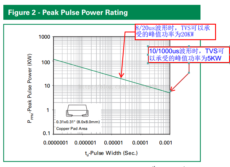 由图2可以看出该TVS的最大功率为5000W,是在浪涌10/1000us的波形能量下测试的。Ipp是基于10/1000波形能量下得到的结果。