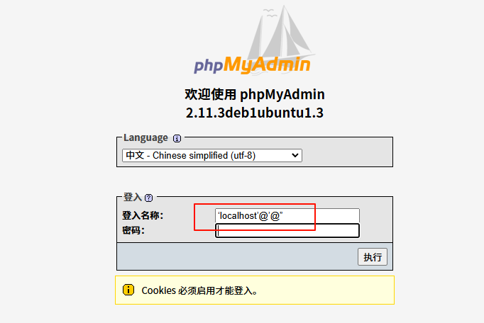 phpMyAdmin 登录页面使用‘localhost’@’@”