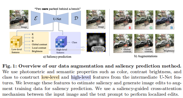 显著性预测模型受限于有限多样性和标注数据的数量。诸如旋转和裁剪等标准数据增强技术改变了场景构成。提出一种新的用于深度显著性预测的数据增强方法,编辑自然图像同时保持真实世界场景的复杂性和变化性。由于显著性取决于高级和低级特征,方法结合学习两者,包括颜色、对比度、亮度和类别等光度和语义属性。为此,引入一种显著性引导的交叉注意力机制,用于在光度特性上进行有针对性的编辑,从而增强特定图像区域内的显著性。