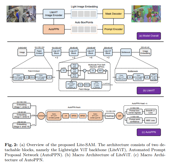 本文介绍Lite-SAM,一个有效端到端解决方案,旨在降低计算成本和冗余。Lite-SAM 由四个主要组件组成:一个简化的 CNN-Transformer 混合编码器 (LiteViT)、一个自动提示网络 (AutoPPN)、一个传统提示编码器和一个掩码解码器。所有这些组件都集成在 SAM 框架内。LiteViT 是一个高性能的轻量级骨干网络,只有 1.16M 参数,相较于最轻的现有骨干网络 Shufflenet,参数减少了 23%。还引入AutoPPN,一种新的端到端提示框和点生成方法。这对传统 Grid Search 采样方法的改进,其独特设计易于整合到任何 SAM 系列算法中,扩展了其可用性。
