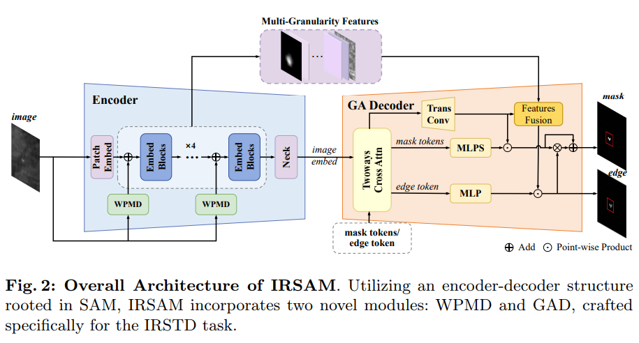 为解决这个问题,提出针对 IRSTD 的 IRSAM 模型,改进SAM的编码器-解码器架构,以更好学习红外小物体的特征表示。具体来说,设计基于 Perona-Malik 扩散 (PMD) 的块,并将其整合到 SAM 编码器的多个层级中,以帮助其捕捉关键结构特征并抑制噪声。