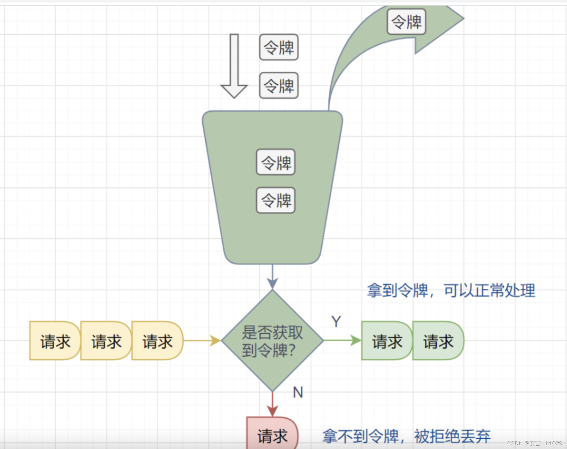 - 系统在接受到一个用户请求时,都会先去令牌桶要一个令牌。如果拿到令牌,那么就处理这个请求的业务逻辑;
