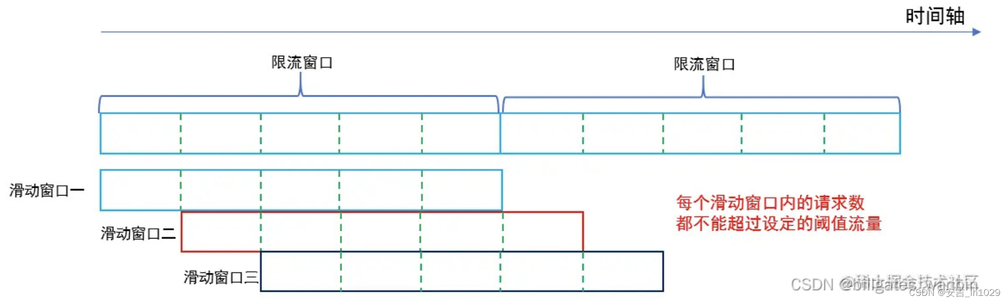 从图中不难看出,滑动窗口算法就是固定窗口的升级版。将计时窗口划分成一个小窗口,滑动窗口算法就退化成了固定窗口算法。而滑动窗口算法其实就是对请求数进行了更细粒度的限流,窗口划分的越多,则限流越精准。