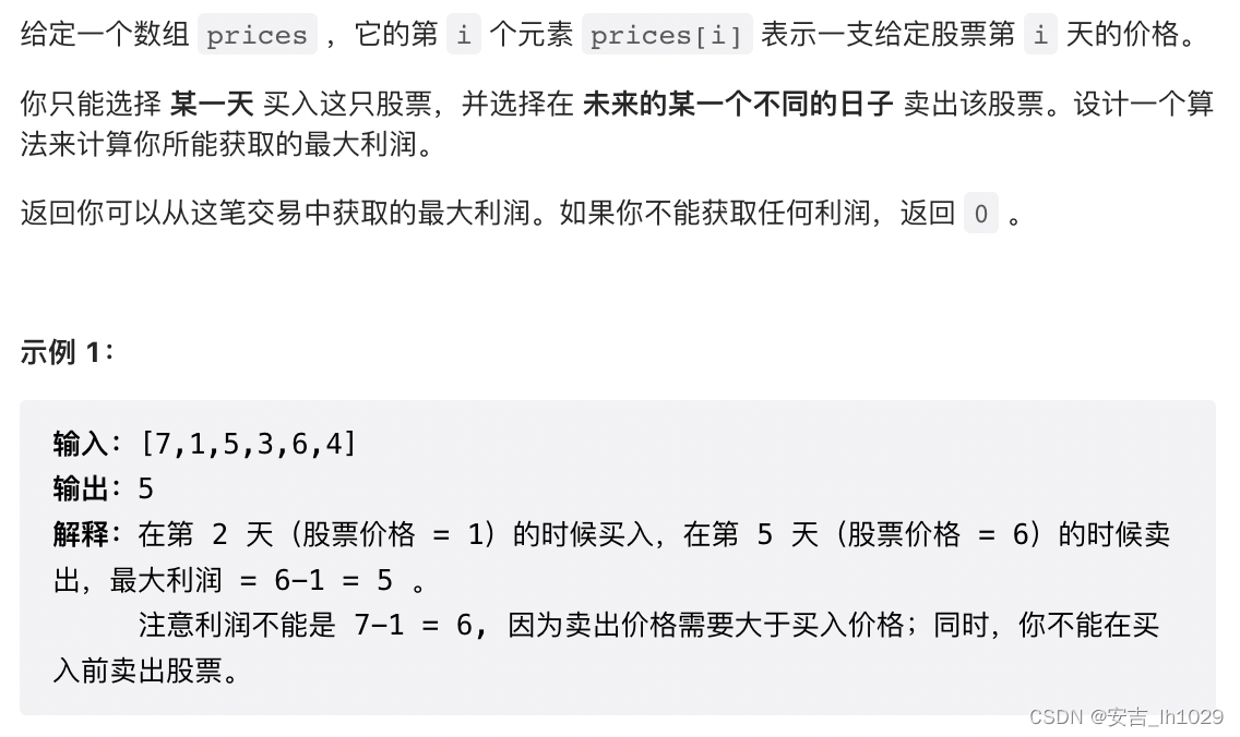 2、要获取利益最大值,我们肯定会想:如果我是在历史最低点买的股票就好了!在题目中,我们只要用一个变量记录一个历史最低价格minPrice 作为买入。卖出则第i天,当前价格减去最低价格作为差价即可,prices[i] - minPrice。