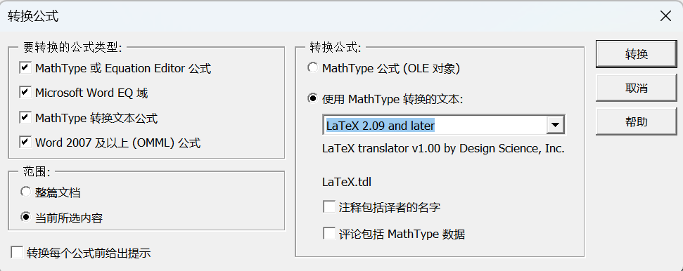 (如果不想单个选中再替换,就全选内容,将之前正常的mathtype公式转换回latex公式