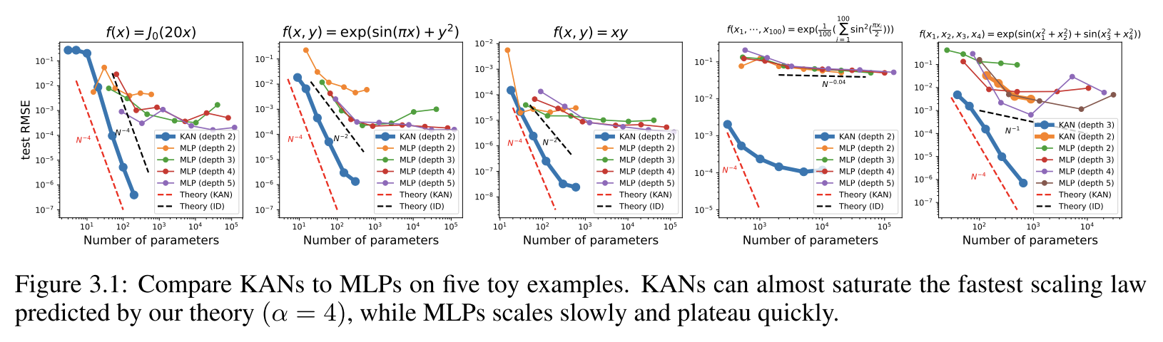 对于PDE求解,2x10 的KAN比4x100 MLP精确100倍(10−7 vs 10−5 MSE),参数效率高100倍( 1 0 2 10^2 102 vs 1 0 4 10^4 104参数)。