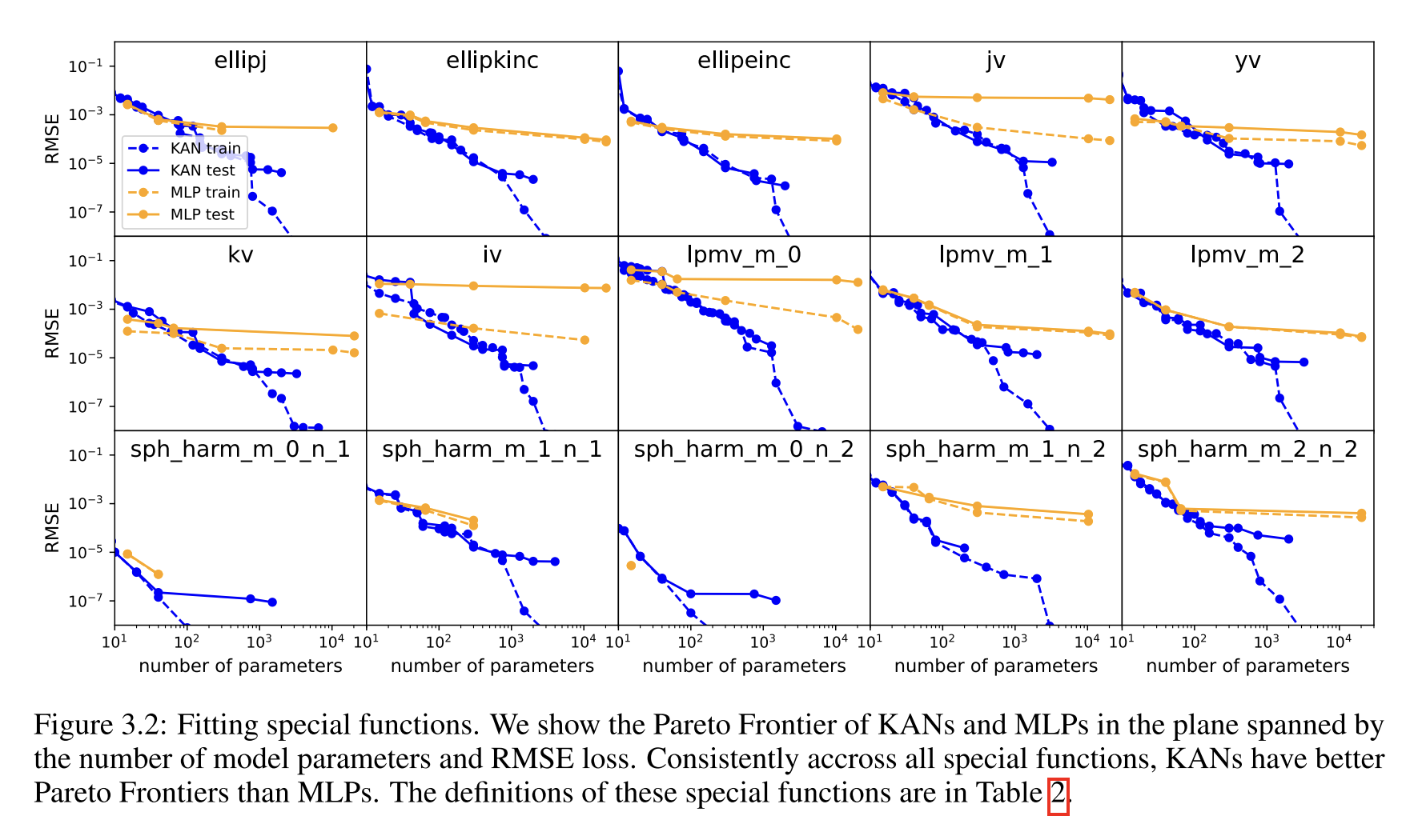 **函数拟合:**KAN比MLP更准确,具有更好的Pareto边界