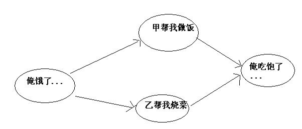 当然你也可以自己做饭烧菜。但是咱们仍然可以看到,我是从一个饿的状态变成了一个饱的状态,也就是我之前空腹,后来我由甲(分支)和乙(分支)两人同时来帮我完成了完成了“做饭”和“烧菜”的功能,而我的状态也从饥饿变成了吃饱的状态(即饭和菜都提交到了我的肚子里),这样咱又有力气干活了。