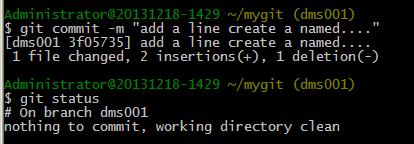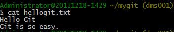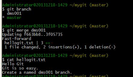 切换回master分支后,再看一下hellogit.txt文件,刚才添加的那句“Create a named dms001 branch.”不见了!因为那个提交是在发生在dms001分支上,而master分支此刻的提交点并没有变: