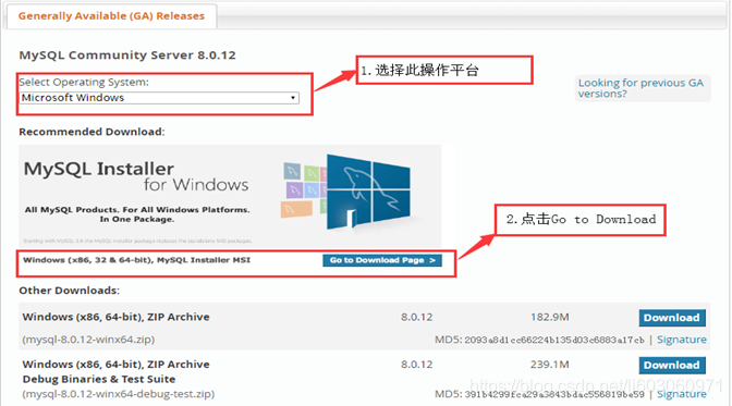 (2)进入MySQL数据库的下载界面后,首先在“Select Operating System”下拉菜单中选择“Microsoft Windows”平台,然后进入MySQL下载页面。