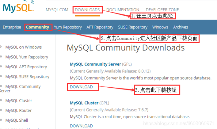 (1)进入MySQL的官网:https://www.mysql.com/。点击DOWNLOADS导航栏,再点击Community(社区版),切换到社区版的下载页面,最后点击MySQL Community Server下边的DOWNLOAD按钮即可进入MySQL数据库下载页面。