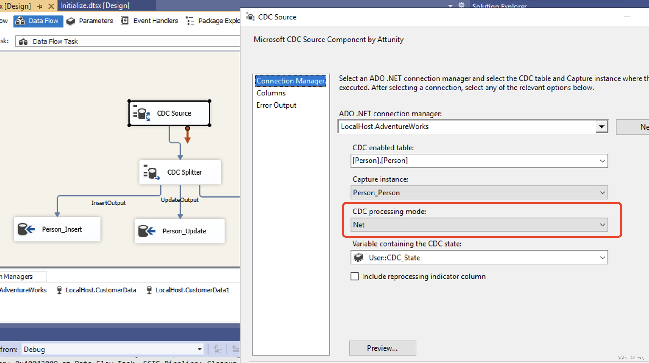 如下图:设置在Data Flow Task中通过CDC Source组件和CDC Split组件实现数据捕获。