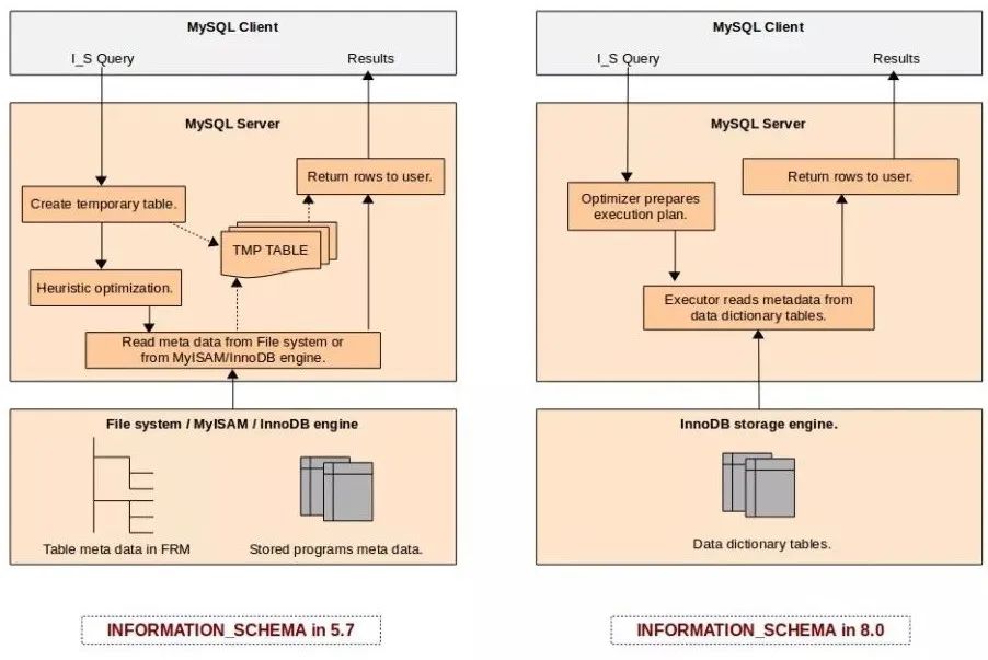 尽管5.7有了一些改进,但INFORMATION_SCHEMA的性能仍然是我们许多用户的主要痛点。在当前INFORMATION_SCHEMA实现方式下产生的性能问题背后的关键原因是,INFORMATION_SCHEMA表的查询实现方式是在查询执行期间创建临时表。