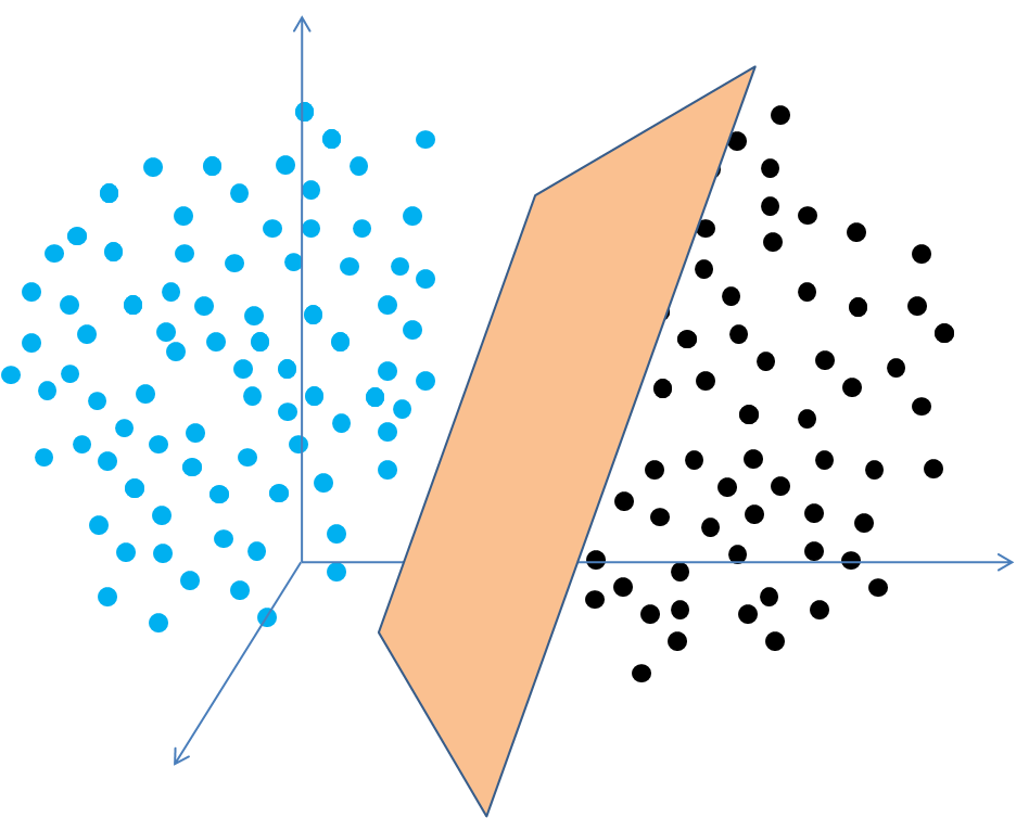 在三维空间中,要分开两个线性可分的点集合,我们需要找到一个分类面:如图3: